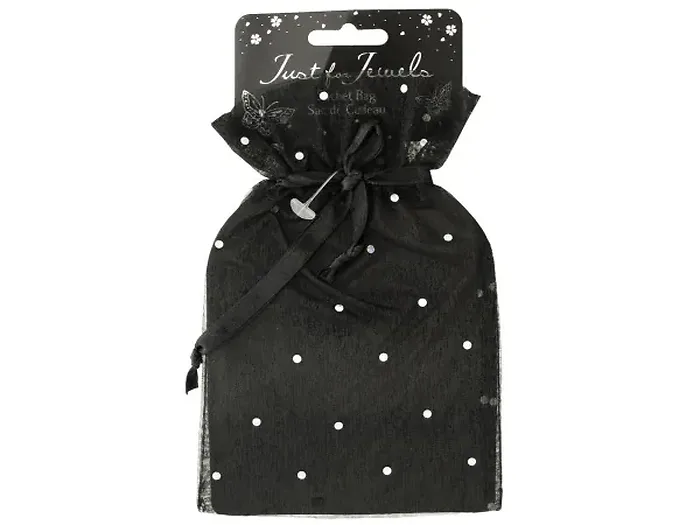 Enhance your gifting experience with this Elegant Jeweled Organza Gift Bag. Perfect for creating fragrant sachets, storing precious jewels, or elegantly packaging gifts, this stunning bag features a transparent black material adorned with iridescent jewel stickers. The black ribbon drawstring closure adds a touch of sophistication. Measuring approximately 6" x 4", it's the ideal size for various uses.