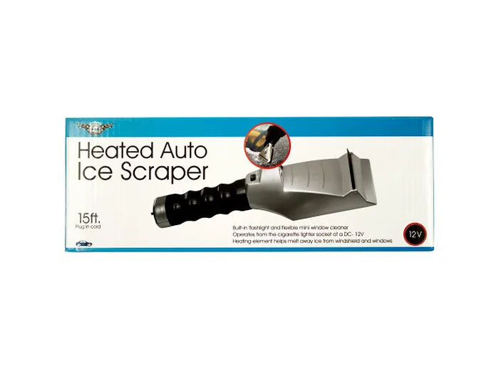 Easily keep your windows clear for safe driving during harsh weather with this Heated Auto Ice Scraper featuring a durable plastic ice scraper with a heating element that helps melt away ice from windshield and windows, a built-in flashlight and a mini squeegee window cleaner. Comfortable handle is textured for a non-slip grip. Comes with a 15 foot plug-in cord and operates from the DC-12V cigarette lighter socket. Measures approximately 10.5" long with a 3.5" wide scraper and 1.75" wide handle. Instructions included. Comes packaged in a hanging box. Box measures approximately 4.25" x 2.25" x 12".