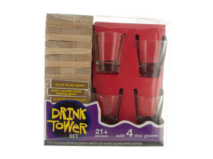 Warm up any party quickly with this fast-moving Drink Tower Wooden Block Drinking Game featuring stacking wooden blocks printed with various drinking instructions and shot glasses to fill with your favorite spirits. Includes 60 wooden blocks and 4 shot glasses. For 21+. Play directions included on back of package. Comes packaged in an individual box. Box measures approximately 7.5" x 3" x 8".