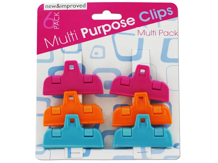 Perfect for sealing food packaging such as cereals, spices and coffee bags, this 6-piece Small Multi-Purpose Clips Set features durable plastic clips that easily open and close. They also work great for sealing craft bags, fastening coupons and more. Each pack includes 6 small multi-purpose clips in magenta, orange and turquoise. Clips measure approximately 2 1/4" wide. Comes packaged to a hanging panel.