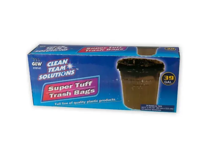Introducing the 39 Gallon Super Tuff Trash Bags, designed to make managing your waste easier than ever. These robust plastic bags are made of high-quality material, measuring 15 microns thick, ensuring durability and strength to handle all your trash needs.
