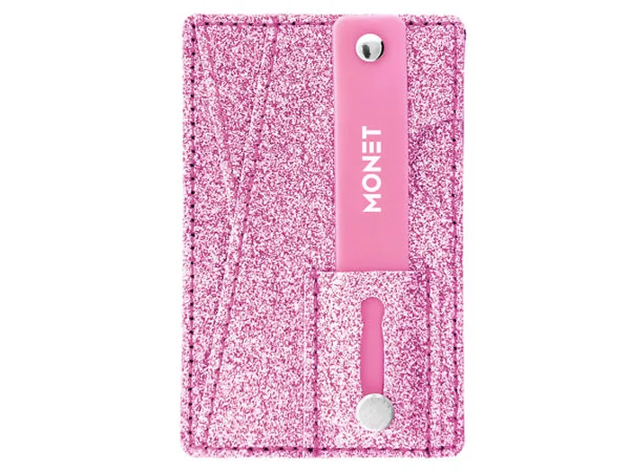 This Monet 3-in-1 adhesive Phone Wallet and Kick Stand in the glamorous sparkly Pink Glitter color is just what you need to not only keep your debit, credit, or gift cards in, but also to prop your phone up on a flat surface and watch a video, or snap a picture. With your phone and card-holder wallet all in one place, you'll have to worry less about misplacing one or the other with less loose articles around you. The wallet features a small strap that serves as both the stand and a small handle for added grip when using your phone. It conveniently holds up to three cards, and slips flat right into your pocket. Simply adhere onto the back of your phone or phone case. The grip wallet is made of split leather, plastic, and metal. The 3-in-1 wallet measures approximately 3.75" x 2.25" x 0.1". The adhesive does not adhere well to glass.