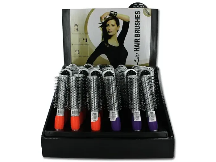 Discover the perfect hairbrushes for every hair type with our Colorful Hairbrush Collection. This selection includes a variety of styles such as flat brushes, round brushes, and paddle brushes, each designed with comfort and functionality in mind. The vibrant plastic handles provide not only a stylish appearance but also a secure grip. Each brush features a sleek silver finish, beautifully complemented by textured orange and purple handles. Measuring approximately 9 1/2 inches in length, these brushes are ideal for home use or salon settings. The countertop display includes a total of 36 pieces, perfect for showcasing in retail environments.