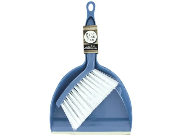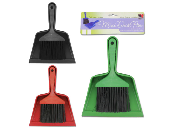 Great for using in kitchens, bathrooms, automobiles or other hard to reach places, this Brush & Dust Pan Combo is a household essential! Made of lightweight yet durable plastic, dust pan has slanted edges for easy pick up and small serrated teeth on the upper edge to help loosen debris from brush bristles. Dust pan and sweeper have interlocking handles. Dust pan measures approximately 12.5" long with an 8.75" opening. Brush measures approximately 10.75" long with 1.25" bristles. Comes in assorted colors. Comes loose.