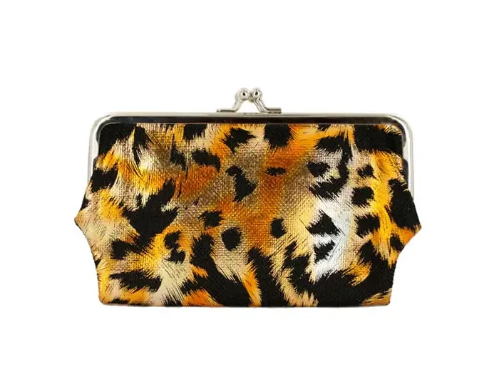 Step out in style with this stunning Metallic Leopard Print Clutch. Designed for a night on the town, it features a chic woven cloth and vinyl exterior adorned with a striking metallic leopard print. The clutch includes two secure sections that close with elegant kiss locks, offering practical card pockets in the center for your essentials.
