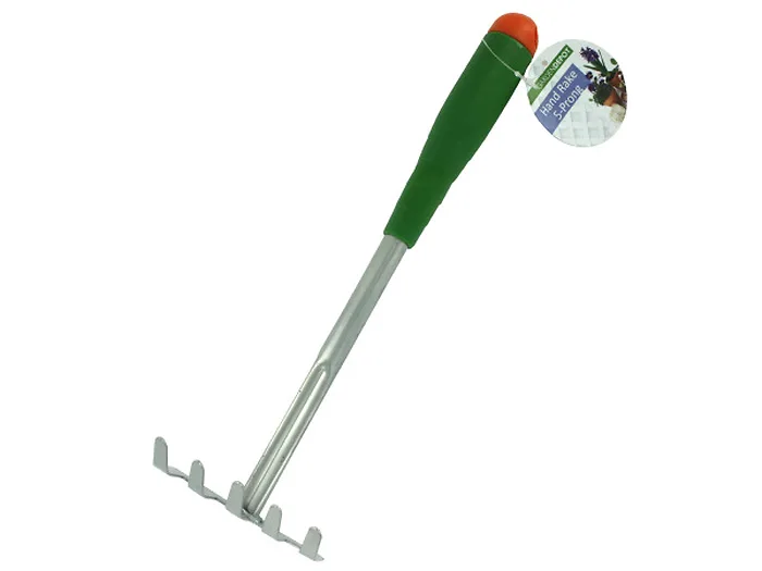 A perfect tool for the gardening enthusiast, this Five-Prong Hand Rake features five pointed metal prongs, making it ideal for breaking up hard dirt or for clearing out weeds. Tool is made of strong metal with a green plastic handle with a hanging hole for simple storage. Measures approximately 11 3/4" long with a 3" x 3 1/2" head. Comes loose with a hang tag.