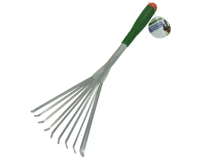 A perfect tool for the gardening enthusiast, this Gardening Hand Rake is small enough to get between bushes, shrubs and flower beds. Each rake has eleven spaced out prongs and a grooved plastic handle with a hanging hole for easy storage. Each rake measures approximately 16 1/2" long and 6 1/4" wide. Comes packaged with a hang tag.