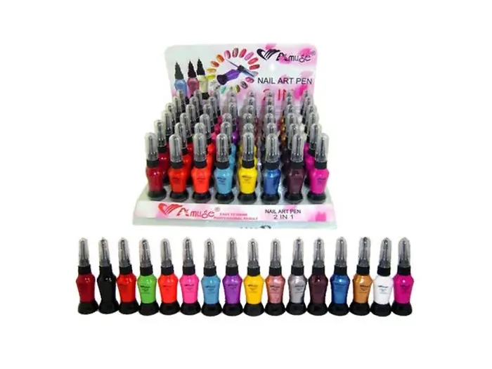 Create stunning nail designs effortlessly with the Nail Art Pen Dual-Use Display Set. This versatile product combines traditional brush-on nail polish in a convenient squeeze bottle with a precision metal drawing tip. The innovative cap includes a built-in needle to ensure smooth polish flow and an outer cap to prevent drying.