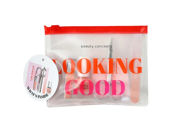 Keep your nails looking good on the go with this 8-piece Beauty Concepts Looking Good Travel Bag Nail Kit featuring 3 Nail Polish Removing Wipes, a nail file, nail scissors, pink nail polish, a plastic nail brush, and nail clippers. Kit comes in a durable plastic storage bag with a zip closure with a tag attached. The bag reads "Looking Good" across the front in orange and pink capital lettters.