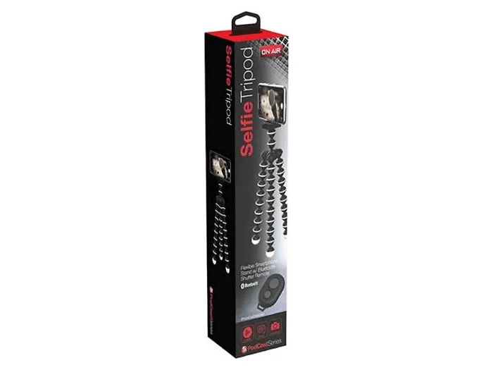 Create perfect tutorials and glossy selfies with the Tzumi ON AIR Flexible Smartphone Holder Selfie Tripod. This lightweight smartphone holder has three flexible legs that can move in any direction. Your phone rests easily in the holster on top while the tripod legs can move every which way. The included Bluetooth shutter remote controls the Selfie Holder. The convenient remote can reach up to 33 feet away! Kick your social media up a notch with this versatile tripod! With twistable legs, you can use the flexible tripod in hard-to-reach places. The box includes 1 adjustable phone stand, 1 remote control, and 1 USB. The selfie stick comes packaged in a high-quality hanging box measuring approximately 11.11" x 2.4" x 2.6"