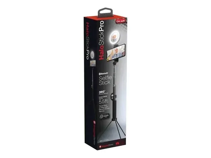 The Tzumi ON AIR Halo Stick Pro 5" Ring Light is designed to elevate your content creation for social media and blogs to a professional standard. This versatile device combines a sturdy smartphone holder and a powerful light ring, allowing you to achieve the perfect shot from any angle with its 360-degree adjustable phone mount.