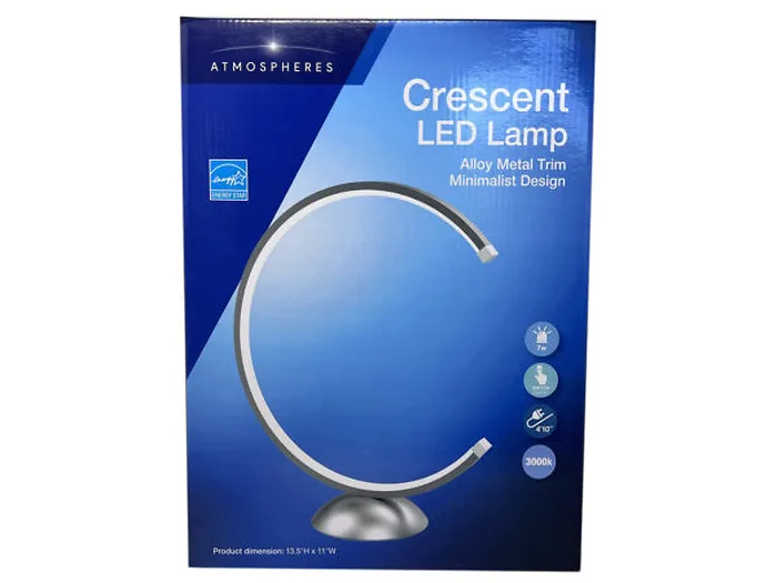 With a sleek minimalist design, the Silver Crescent Moon LED Lamp is the perfect way to add simple and elegant decor to any living space. The LED has a silver backing and bends around in a thin crescent moon shape creating a unique light source. The LED is cool to the touch and has a lifespan of 40,000 hours. Functional and stylish, this 7-watt lamp sits on a rounded base. It uses a standard wall plug connector and has a power switch on the cord. Perfect for office and living room. This unique lighting decor measures 13.5" tall with an 11" base. Comes packaged inside a color shelf box.