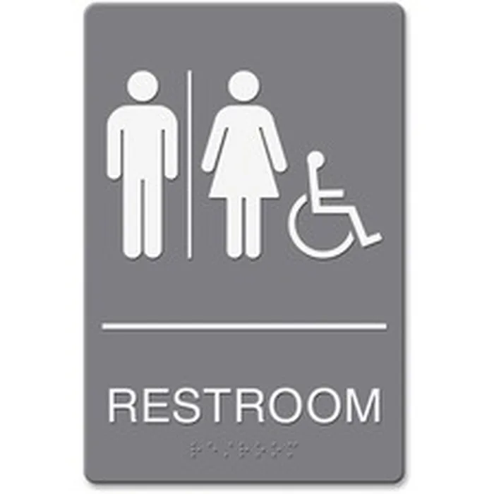 Indoor wall sign features a highly visible "restroom/wheelchair accessible" image for an effective way to communicate information to customers, employees and guests. Raised tactile graphic is designed with Grade 2 braille to create a more efficient display. Double-sided adhesive tape lets you quickly mount the sign to a smooth door or wall. Wall sign meets Americans with Disabilities Act (ADA) requirements.