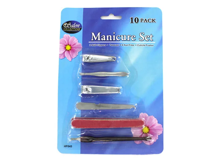 Great for home or professional use, this 10-piece Manicure Set includes: 2 steel nail clippers, steel tweezers, steel cuticle pusher with plastic handle and six nail files - 1 steel & 5 emery double-sided boards. Approximate measurements: 4" emery board, 1 3/4" small nail clippers, 2 3/4" tweezers, 2 1/4" large nail clippers, 3 1/4" metal nail file, 4 1/2" cuticle pusher. Comes packaged in a blister pack.