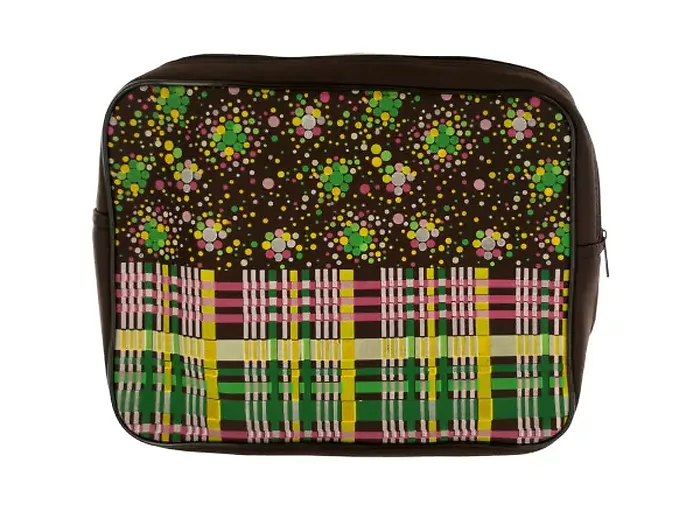 Protect your laptop in sweet style with the Colorful Plaid Chocolate Lollipop Laptop Sleeve. This stylish sleeve features a durable brown neoprene material adorned with a vibrant plaid and polka dot print. It includes vinyl piping for added durability, an interior slip pocket for organization, and a secure zipper closure.