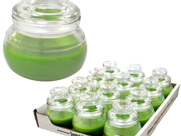 Each jar contains 2.5 ounces of wax and measures approximately 3.25 inches tall by 3 inches in diameter. Designed for retail, the countertop display includes 12 pieces, ideal for showcasing in stores.