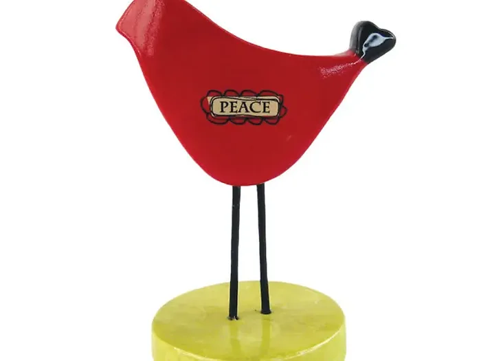 Bring serenity to your home with this delightful 'Peace' Ceramic Bird Figurine. This charming piece features a solid red bird adorned with the word 'Peace' printed on both sides, elegantly perched on a vibrant yellow-green patterned ceramic base.