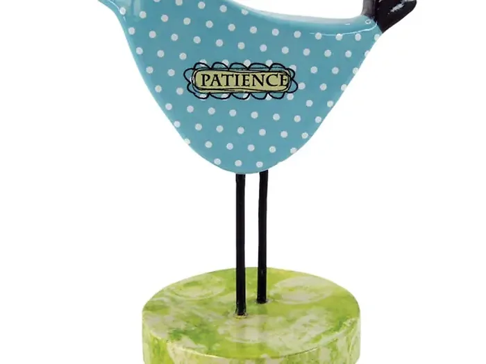 Add a touch of serenity to your home with the 'Patience' Polka Dot Bird Figurine. This charming piece features a light blue bird adorned with playful polka dots and the word 'Patience' displayed prominently on both sides. Its metal legs rest atop a ceramic base with an attractive green pattern.