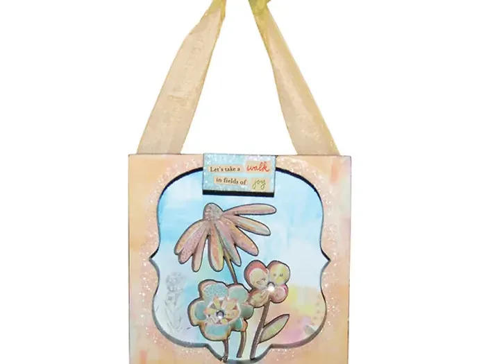 Enhance your living space with the charming Fields of Joy Inspirational Hanging Shadow Box. This decorative piece features a composite wood box with a beautiful cutout frame adorned with glitter, showcasing a jeweled flower scene. Accompanying this delightful artwork is a little plaque that reads, "Let's take a walk in the fields of joy".