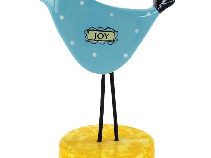Bring a touch of happiness to your space with this charming 'Joy' Ceramic Bird Figurine. This delightful piece showcases a light blue bird adorned with playful polka dots and the word Joy printed on both sides, perched on elegant metal legs above a golden yellow floral patterned ceramic base.