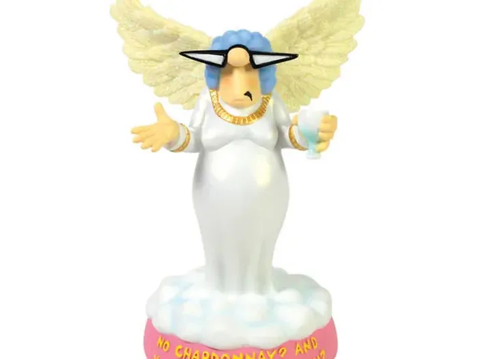 Elevate your home decor with a touch of humor through the No Chardonnay? Funny Wine Figurine. This delightful piece features a charming resin figurine of an elderly woman with sparkling angel wings, proudly holding a wine glass while perched on a fluffy cloud. The base of the figurine showcases the witty phrase, "No chardonnay? And you call this heaven?" Perfect for wine lovers and a great conversation starter!