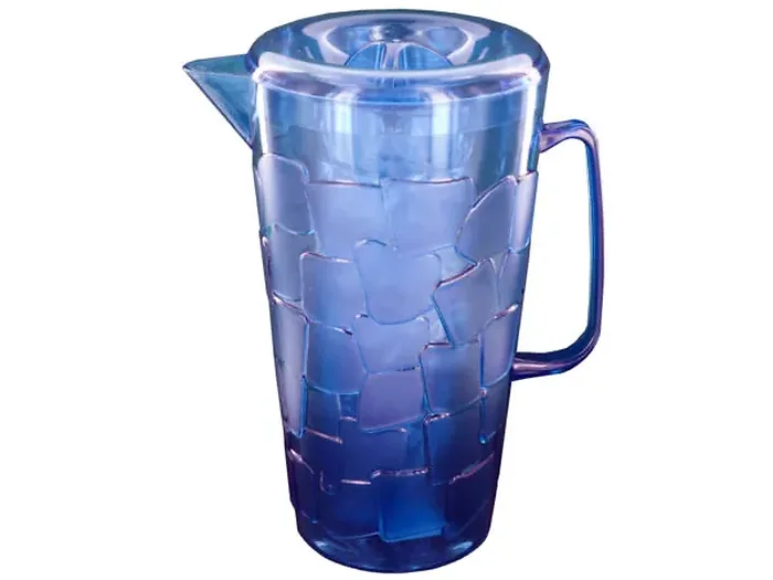 Perfect for any gathering, this Durable Plastic Pitcher Set includes a spacious pitcher and four matching tumblers. The pitcher is designed to store and serve beverages like water or iced tea with ease. Its sturdy construction and comfortable handle make pouring a breeze. The surface showcases a stylish raised ice cube pattern, lending an attractive touch.