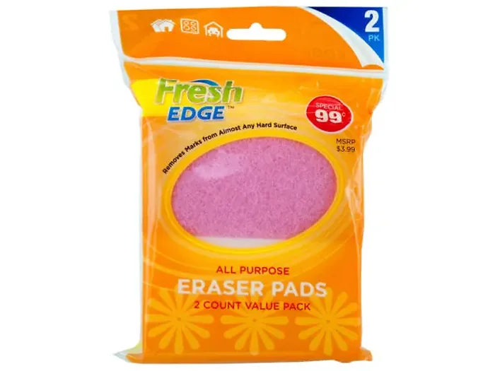 Effortlessly clean surfaces with our Versatile Cleaning Eraser Pads Set. This 2-pack features heavy-duty, water-activated eraser pads designed for maximum effectiveness. Each pad has a gentle sponge surface on one side for delicate cleaning, while the scour surface on the opposite side tackles tough stains and scuff marks.