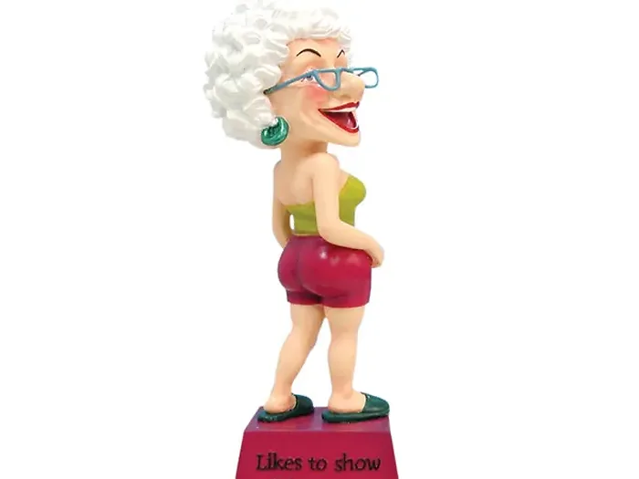 Add a touch of whimsy to your home with this delightful Biddys 'Botox' Figurine. This charming resin piece depicts an older woman dressed in short shorts and a strapless top, standing proudly on a vibrant berry pink platform. The figurine showcases the phrase 'Likes to show off her Botox!' making it a humorous addition to any space.