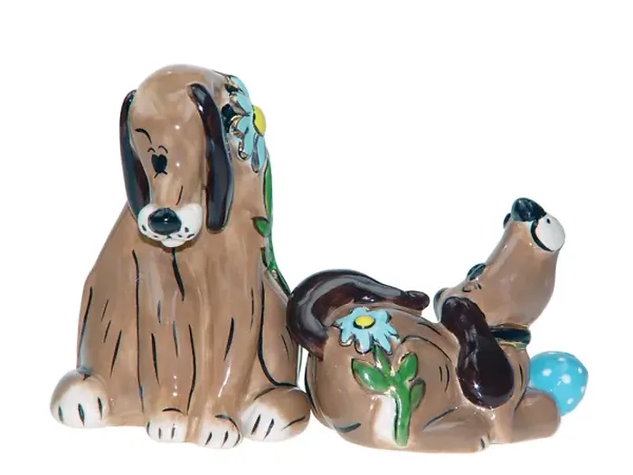 Add a dash of charm to your dining experience with our Adorable Puppy Love Salt & Pepper Shakers. Crafted from high-quality glazed ceramic, these delightful shakers showcase playful puppy designs adorned with lovely flower accents and a fun play ball to brighten up your table setting.