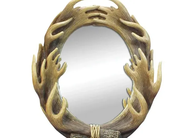 Enhance your home decor with our Rustic Moose Antlers Oval Mirror. This stunning wall mirror features a beautifully crafted glass mirror surrounded by a unique resin frame designed to resemble joined moose antlers.