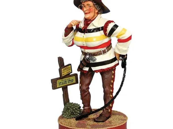 Add a touch of humor to your home decor with the Miss Max Figurine. This charming resin piece depicts an Old West woman, complete with a witty phrase: 'Come Friday, me and my wagon are outta here!'. Standing at approximately 7.25 inches tall, it sits on a base measuring 3.5 x 2.75 inches. Each figurine comes in an individual box, making it a perfect gift for friends or family who appreciate a good laugh.