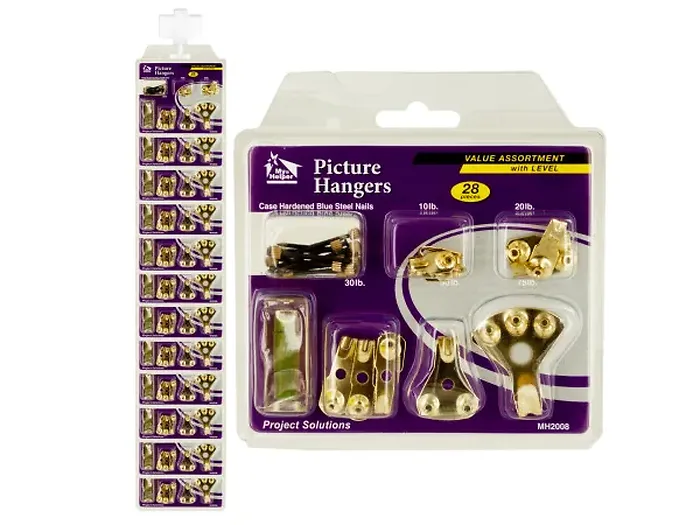 Transform your home into an art gallery with the Professional Picture Hanger Kit. This comprehensive 28-piece kit includes everything you need to hang photos and artwork securely and professionally. It features a variety of metal hardware suitable for different sizes and weights, along with a convenient picture level to ensure perfect alignment.