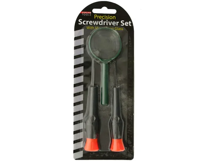 Perfect for working with small objects, this 3-piece Precision Screwdriver Set features small flathead and Phillips screwdrivers with hardened and tempered steel blades and swivel-head anti-slip handles and a mini magnifying glass. Screwdrivers measure approximately 4.25" long and magnifying glass measures approximately 4" long. Comes packaged in a blister pack.