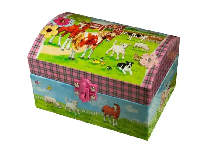 Delight in the charm of the Whimsical Farm Animals Musical Jewelry Box, perfect for holding your precious jewelry and trinkets. This enchanting box features a playful farm animal theme, crafted from durable cardboard with a glossy finish, enhanced by glitter and jeweled flower accents.
