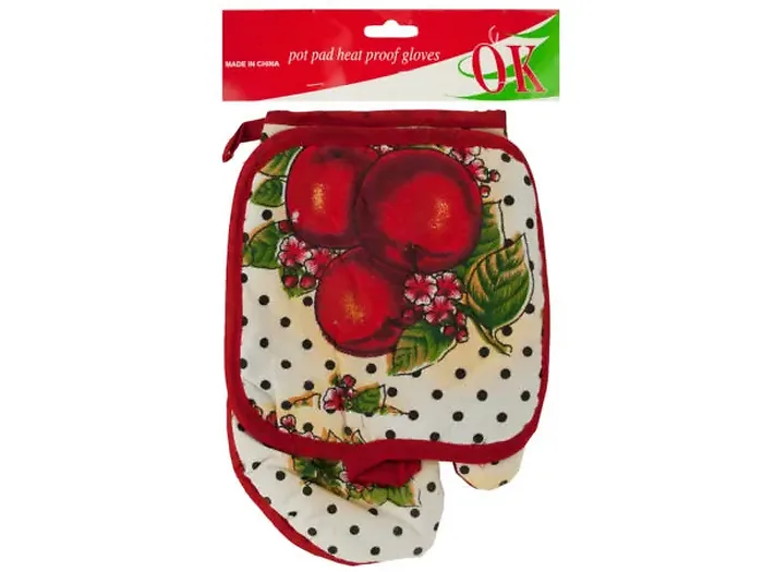Each piece includes convenient hanging loops for easy storage, and the mitt measures approximately 9.5" x 6.25", while the pot holder is about 6.75" x 6.75". This set comes in assorted styles and is packaged in a poly bag with a header card for presentation.