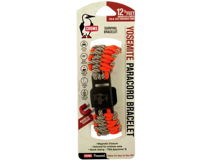 The Chums Yosemite Paracord Survival Bracelet is an essential addition to any survival kit. This durable bracelet is crafted from neon orange and grey braided paracord, consisting of 12 1/2 feet of 550-pound test parachute cord. The bracelet features a reliable magnetic closure, ensuring a secure fit.