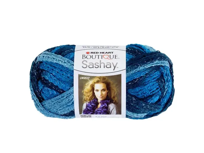 Unleash your creativity with the Gradient Blue Metallic Sashay Yarn, perfect for creating fashionable scarves and more.