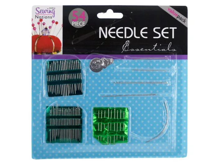 Great for beginners to professionals, this 54-piece Sewing Needle Set comes with needles for every sewing project imaginable. Set includes: 40 regular needles, 9 threading needles, 1 curved needle, 4 large sized needles and 1 threader. Comes packaged in a blister pack.