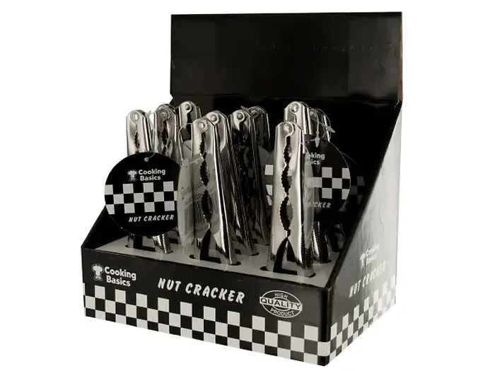 Enjoy a variety of nuts with this heavy-duty 6.5-inch Nut Cracker, crafted from strong metal for durability. The uniquely designed jaws feature various sizes to accommodate nuts of all shapes and sizes. Perfect for commercial use, this counter top display includes 12 pieces, ensuring you'll always have a nut cracker on hand for your customers.