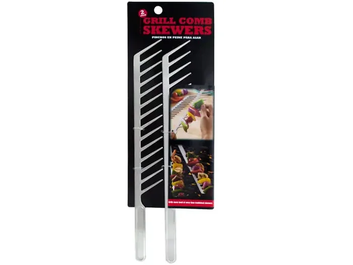 Enhance your grilling experience with our Premium Stainless Steel Grill Comb Skewers Set. This innovative 2-piece set allows you to grill more food at once compared to traditional skewers. Each metal skewer features multiple pronged teeth that effortlessly slide shrimp, beef, chicken, and vegetables onto the stainless steel teeth, securing them in place. Enjoy grilling even the most delicate foods like tomatoes or scallops without worrying about them spinning or falling off.