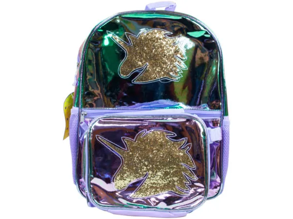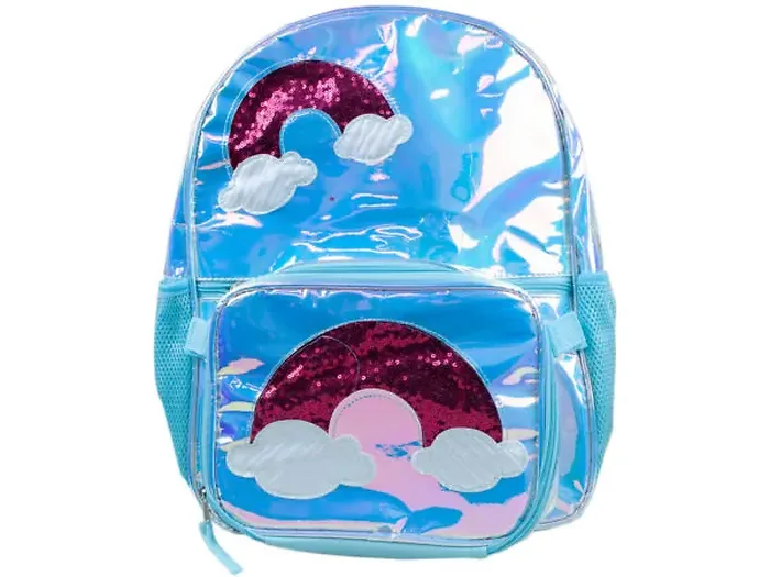 The Metallic Blue Backpack with Insulated Lunch Bag is a stylish and practical choice for school, featuring a fun design that kids will love. This trendy backpack is adorned with vibrant red sequin rainbows and holographic clouds, making it stand out. The adjustable padded shoulder strap ensures a comfortable fit, while the insulated lunch box with a woven handle conveniently attaches to the backpack with hook and loop straps. Additionally, the backpack includes two mesh water bottle holders and multiple compartments for organized storage. Dimensions: Backpack - 15.50" x 12" x 4", Lunch Box - 10" x 7.50" x 2".