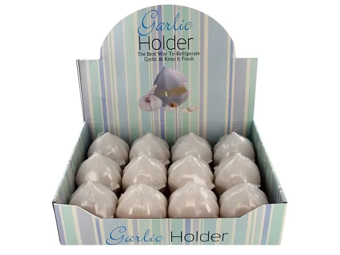 The Unique Garlic Keeper is the ideal kitchen gadget for preserving garlic freshness. Its inventive garlic shape not only looks good but also functions well, keeping your garlic protected and ventilated. Made from sturdy off-white plastic, this holder features integrated ventilation holes at the bottom to ensure optimal air circulation. Each display contains 12 holders, each shrink-wrapped for quality assurance and protected with a label. The holder measures 3 1/2 inches in height and has a diameter of 3 1/2 inches.