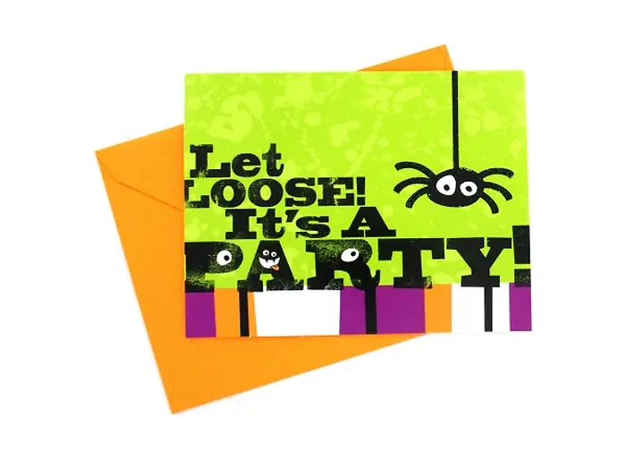 Each pack includes 10 invitations that have designated areas for 'For', 'Date', 'Time', and 'Place'. The eye-catching lime green color with a black spider and bold wording will surely set the mood for your event. Each set also comes with vibrant orange envelopes to complete the look.
