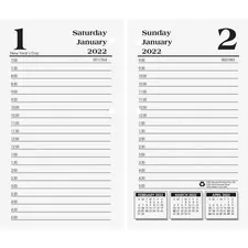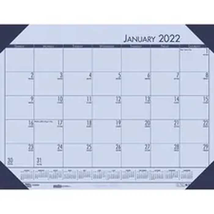 Ecotones Desk Pad offers a year-round organization tool at your fingertips. One-page-per-month format ranges 12 months from January to December. Each month offers faintly ruled daily blocks (2-7/8" x 2-1/4"), Sunday-through-Saturday scheduling, holidays, count of days/days remaining, and a full-year calendar reference across the bottom. Nonrefillable desk pad has four reinforced, leatherette corners to secure the planning pages.
