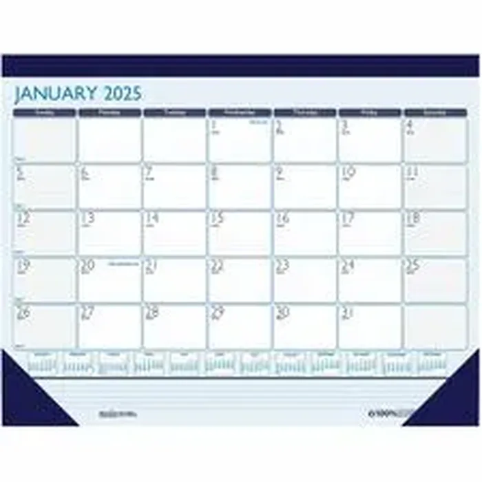 Marketing Information:Recycled Contempo Desk Pad features eye-pleasing, soft colors and graphics. Dated planning pages range 12 months from January to December. One-page-per-month format includes daily blocks, Sunday-through-Saturday scheduling, numbered weeks, count of days/days remaining and full-year reference calendar along the bottom. Large, lightly ruled daily blocks are 3" x 2" for neat notations and provide plenty of note space. Monthly pages are bound and perforated at the top with blue leatherette binding. Two matching, chipboard reinforced corners hold paper in place all year. The FSC certified paper is printed with soy-based inks and made with a high percentage of post-consumer recycled fiber.