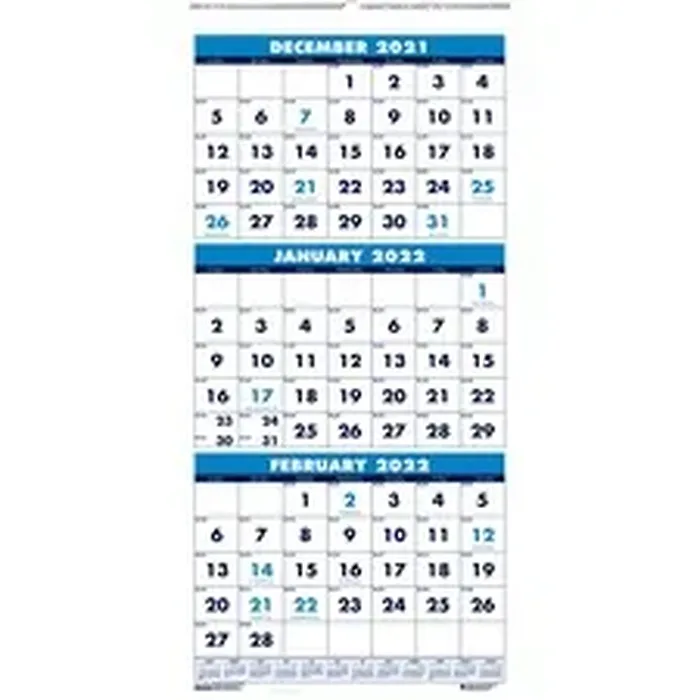 Three-month wall calendar is the perfect size for cubicle areas. Design is vertical and compact so you can hang it in space-limited areas. Dated planning pages range 14 months from December to January. Each page features three months in equal size - previous, current and future. This one-page-per-three-month format includes two-color printing, large numbers that can be seen from a distance, unruled daily blocks (1-1/6" x 1"), holidays highlighted in teal, Sunday-through-Saturday scheduling, and a full-year reference calendar at the bottom. Wire binding and calendar pages contain a high percentage of post-consumer recycled material.