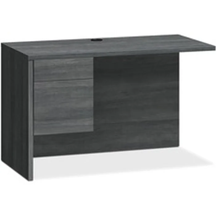 Left return with 3/4 pedestal is a part of HON 10500 Series Wood Laminate Furniture. To create an L-shaped layout, use with the 10500's right-pedestal desk. It can also be used with desk shells, peninsulas and corner units. Left return with formal, full-height modesty panel features one box and one file drawer. Locking drawers offer five-sided construction for easy drawer alignment. Interchangeable, core-removable lock makes rekeying quick and easy. Box drawer operates on ball-bearing suspension with 3/4 extension. File drawer extends fully on ball-bearing suspension. Included hangrails are designed for side-to-side letter-size or legal-size filing and front-to-back letter-size filing. Top and end panels are made with durable, thermal-fused laminate over durable, 1-1/8" thick, solid-core high-performance particleboard and resist warping, scratches and stains. One-cord, pass-through, 3" grommet in the top is designed to reach electrical wall outlets while routing wires and cables.