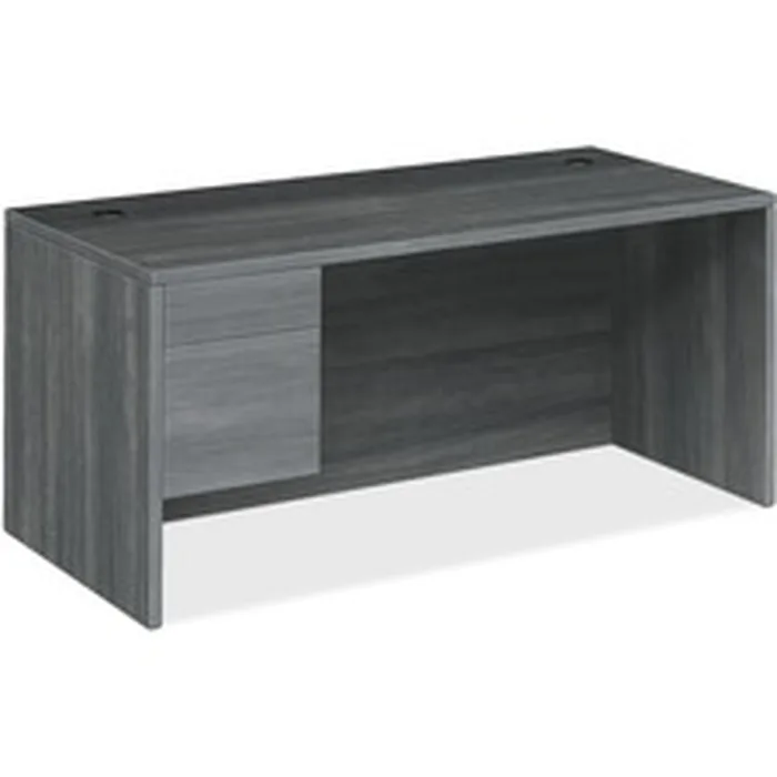Left-pedestal desk is part of HON 10500 Series Wood Laminate Desking that offers practical functionality and uncompromising durability. Durable, 1-1/8" solid-core, high-performance particleboard resists warping. Laminate is scratch-resistant, stain-resistant and spill-resistant. Single-pedestal desk features a full-height modesty panel and 3/4 pedestal with one box and one file drawer. Drawers lock and offer five-sided construction for easy drawer alignment or replacement of drawer fronts. Interchangeable, core-removable lock makes rekeying quick and easy. Box drawers operate on ball-bearing suspension with 3/4 extension while the file drawers extend fully on ball-bearing suspension. Built-in hangrails are designed for side-to-side, letter-size or legal-size filing and front-to-back letter-size filing. Two round grommets (3") in the desktop offer easy cord management.