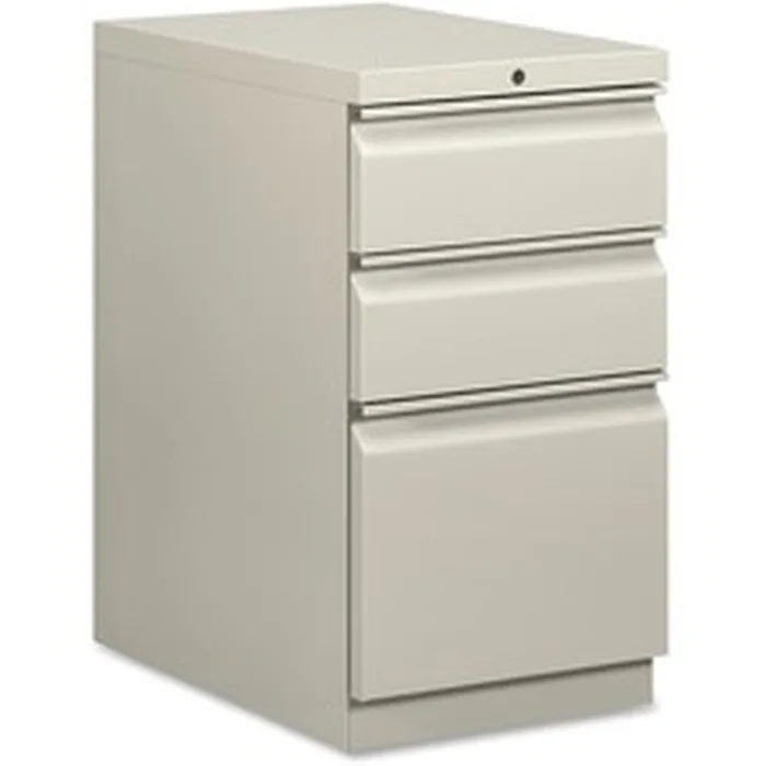 Mobile pedestal with HON Brigade Series 800 lateral-pull design fits under standard HON Initiate, 38000 Series and 29-1/2" worksurfaces. Freestanding pedestal offers one file drawer and two box drawers. High-sided file drawer features two crossrails and accommodates front-to-back filing for letter-size, hanging file folders. Each box drawer has one adjustable divider and a pencil tray. Light gray pedestal also offers a 22-7/8" depth, ball-bearing suspension on the file drawer (90 percent extension), and roller suspension on two box drawers (75 percent extension). Counterweight inhibits tipping when opening more than one drawer. Pedestal is also equipped with a HON One Key interchangeable, core-removable lock; fixed front casters; and swivel rear casters. Pedestal meets or exceeds ANSI/BIFMA and ISTA performance standards.