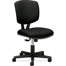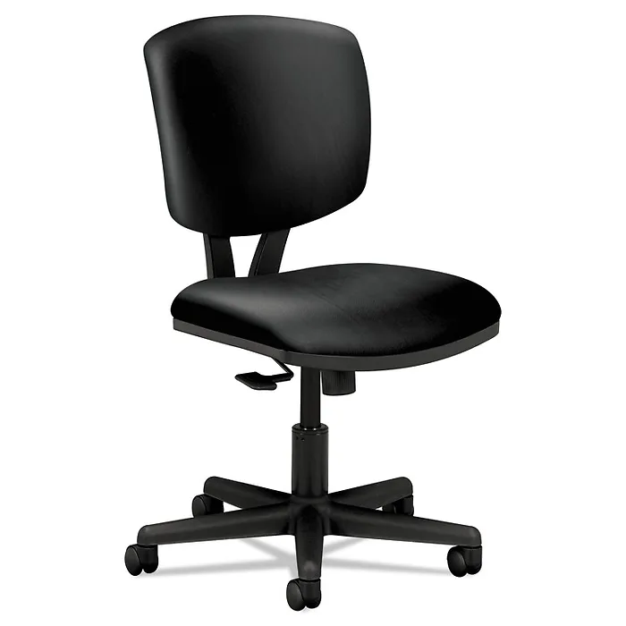 Volt task chair offers black leather upholstery, comfort, function, and style and adapts to each user with simple comfort controls for added flexibility. Generous proportions and a contoured back deliver optimal comfort. Functions include pneumatic seat-height adjustment, 360-degree swivel, dual-action synchro-tilt, tilt tension and tilt lock. This ergonomic task seating design includes a 17-1/4" wide back and seat that are fully padded, and 2-1/2" hooded dual-wheel casters. Seat size is 18-1/2" wide x 18-3/4" deep. Seat-to-floor height ranges from 18" to 22-1/4". Distinctive, V-shaped back measures 17-1/4" wide x 18-3/4" high from the seat. Chair also features a plastic outer back and black frame. Chair meets or exceeds applicable ANSI/BIFMA and ISTA performance standards. Height-adjustable arms are sold separately.